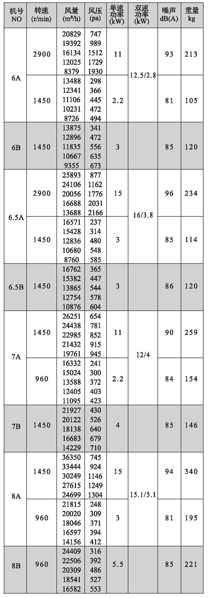 注:雙速風(fēng)機(jī)重量參考同號(hào)中高速風(fēng)機(jī)的重量。