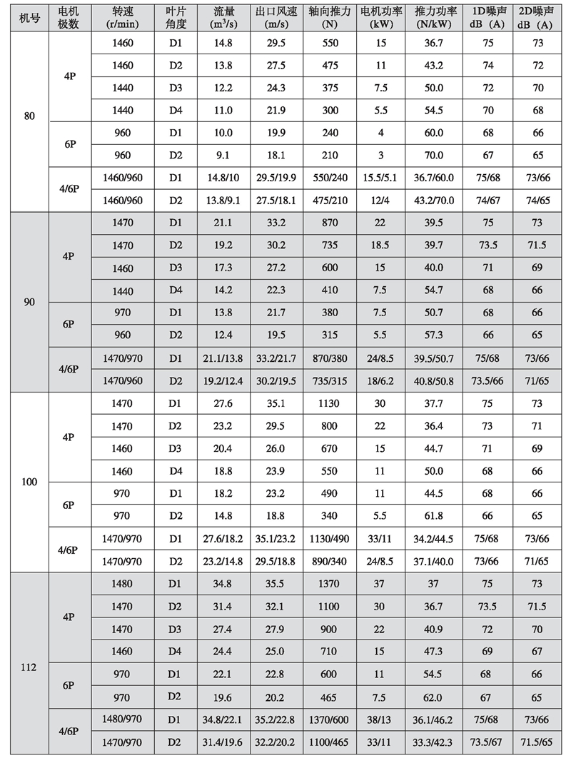 5)性能參數表中所列噪聲值為在野外、距風機出口10米、45度角處測量的A聲級